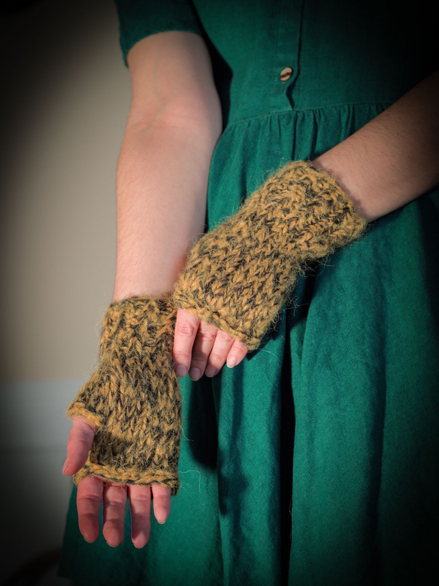Les mitaines sont tricotées en laine double jaune et noir effet chiné/ chevron.