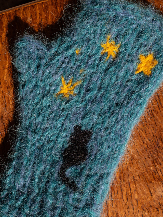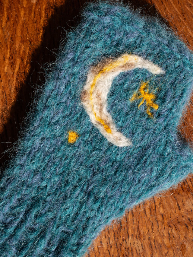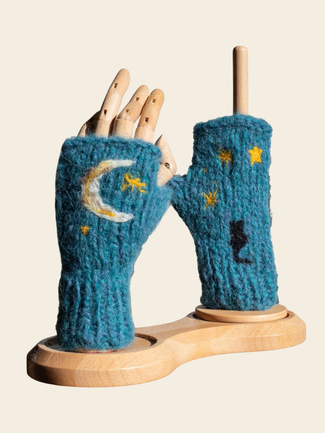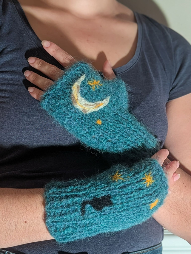 Mitaines tricotées à la main et décorées par un motif de chat et de lune laine feutrée.