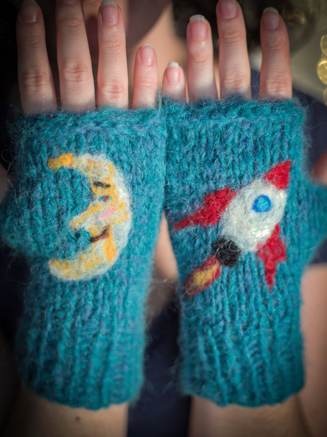 Mitaines tricotées à la main et décorées par un motif en laine feutrée