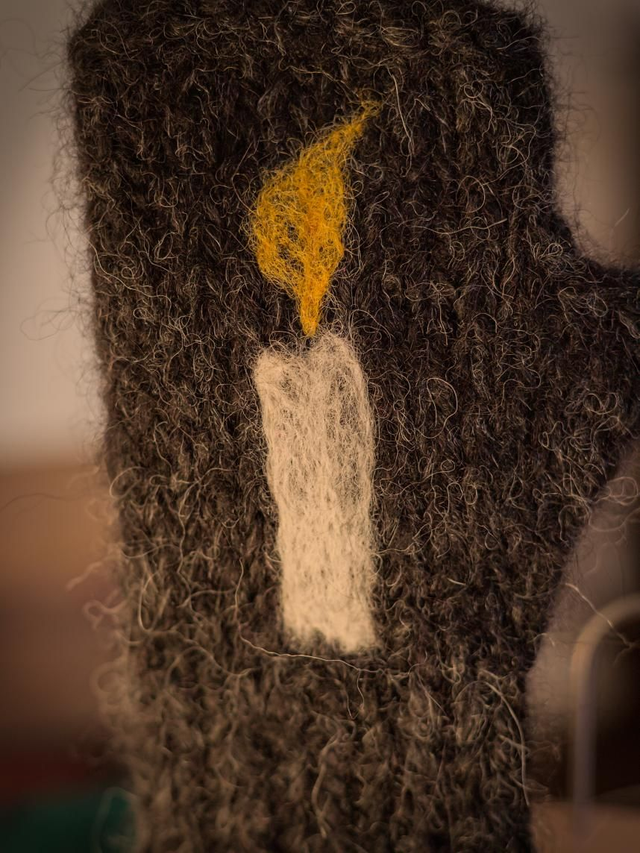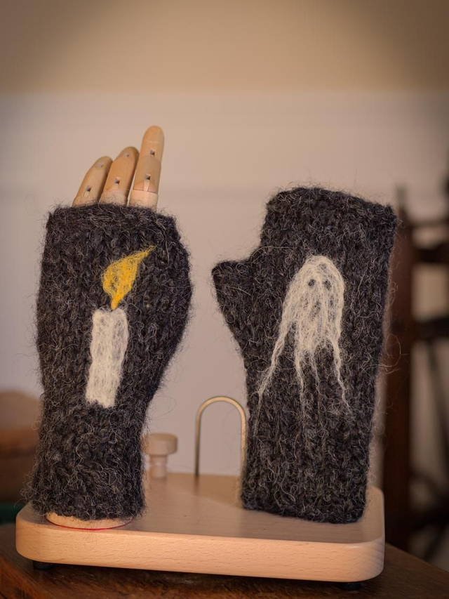 Mitaines tricotées à la main en laine noir/gris anthracite et décorées par un motif de fantôme et de bougie réalisés en laine feutrée.
