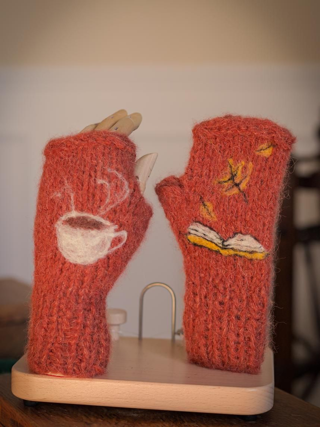 Mitaines tricotées à la main couleur rouille brique et décorées par un motif de livre et feuilles d'automne d'un côté, et une tasse de café de l'autre, réalisé en laine feutré